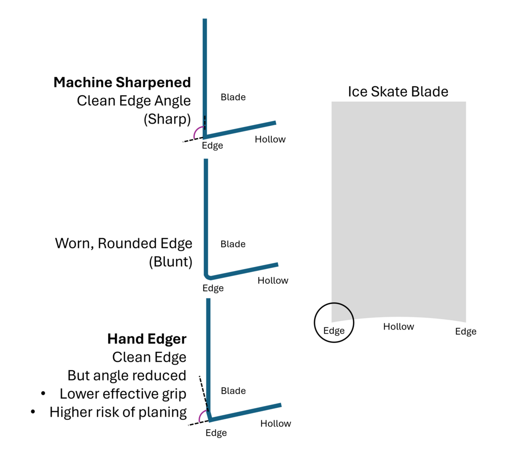 This is why skates that are frequently re-edged often feel “sharp but skiddy” or lack consistent grip in turns.